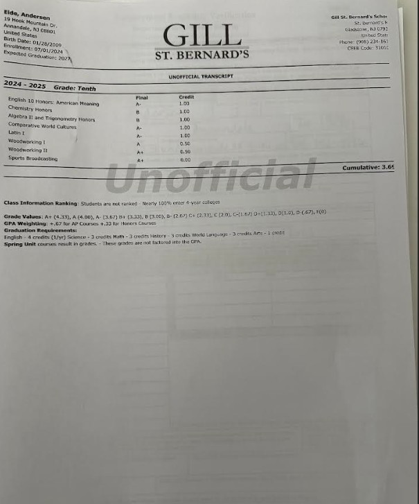 | Sophomore Year | Varsity @ Gill St. Bernard's Private |