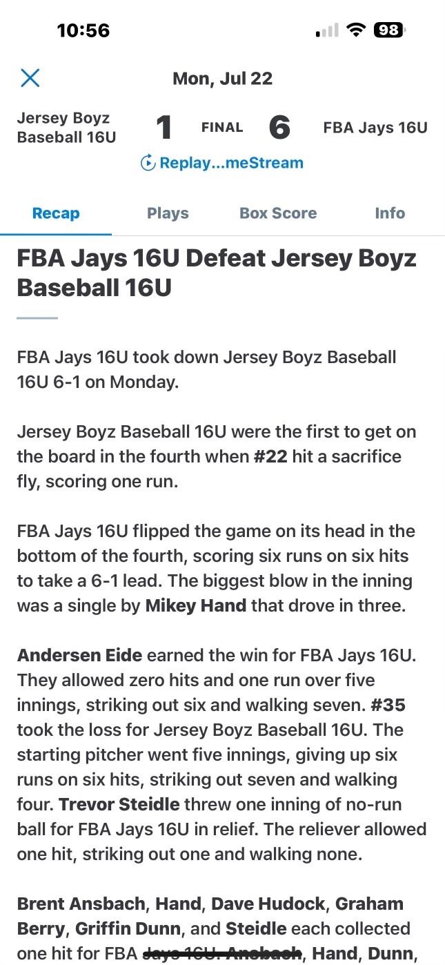 A 2027 RHP/OF for the FBA Jays out of New Jersey. A 2-sport athlete also playing soccer at Gill St. Bernard's- an elite College Prep Private School. Diligent student with a 4.0 GPA in all honors classes,looking to major in business or communications in college. As a pitcher throws a 2-seam, 4-seam, changeup & slider with a fastball velo in the 74-75 range. Locates & mixes pitches well and has late break on his slider to disrupt rhythm. This past summer had a 1.4 ERA. Also plays corner OF with a strong arm & quick jump to the ball. A disciplined contact hitter who possesses power with a high OBP. Also able to hit situationally to all fields & smart on the bases. A coachable, humble, confident player with a strong work ethic. Looking forward to playing baseball at the next level.